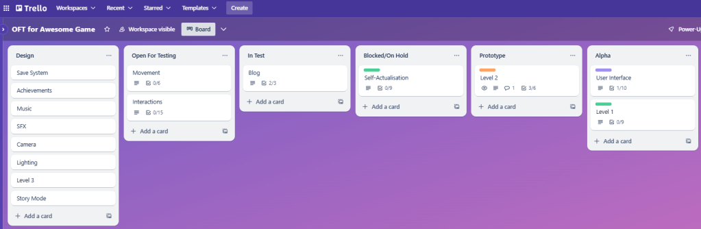 The Open For Test (OFT) Trello board. The idea was to emulate a “submission” into certification, but instead of testing an entire game, we’d test individual features. Each feature had its own versions, its own bug reports, and by using a Trello board, I aimed to mimic the publisher’s perspective during a certification process.