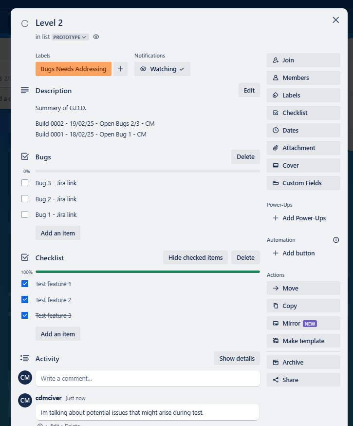 When I was ready, I moved it to In Test, went through the checklist, and logged any discussions with the dev in the comments for future reference. Bugs went into Jira, and I linked them back to the Trello card so the Checklist icon showed how many bugs were associated with the feature. I also applied a colour label to indicate the severity of the bugs.
